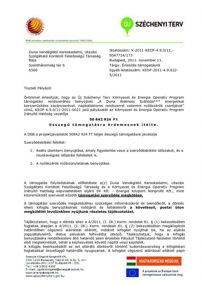 Jelen energiakorszerűsítési projektünkben tervezett fűtésrekonstrukciót és nyílászáró cserét 2013. szeptemberére maradéktalanul sikerült elvégeznünk. A kivitelezés eredményeként egy, a legújabb műszaki megoldásokat felvonultató, energiahatékony szállodaépületet sikerült kialakítanunk, mely ugyanakkor maradéktalanul megőrizte műemlék jellegét.